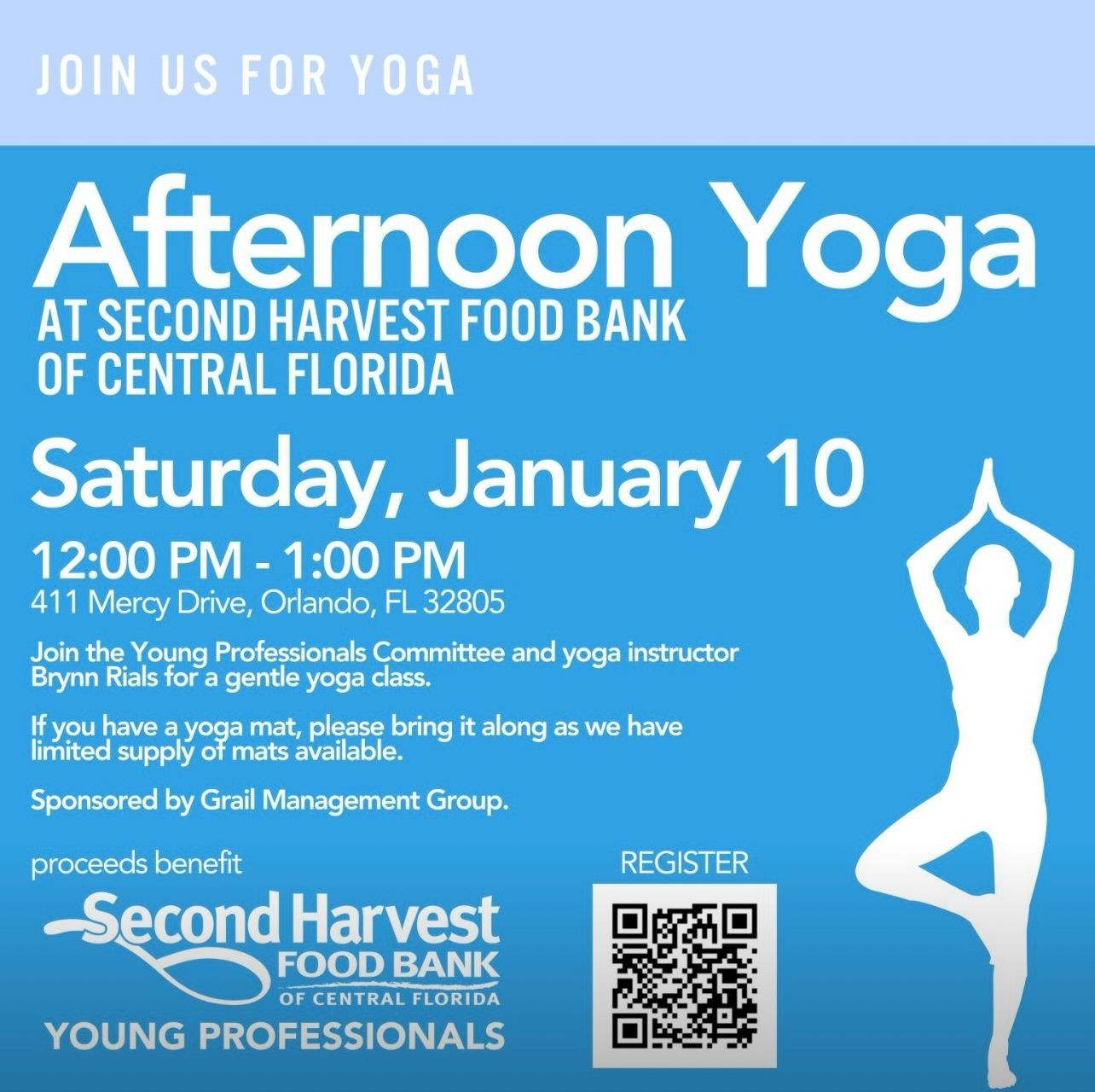Join the Young Professionals Committee and yoga instructor Brynn Rials for a gentle yoga class. if you have a yoga mat, please bring it along as we have limited supply of mats available. Sponsored by Grail Management Group. Buy your tickets today! Proceeds benefit Second Harvest Food Bank of Central Florida.