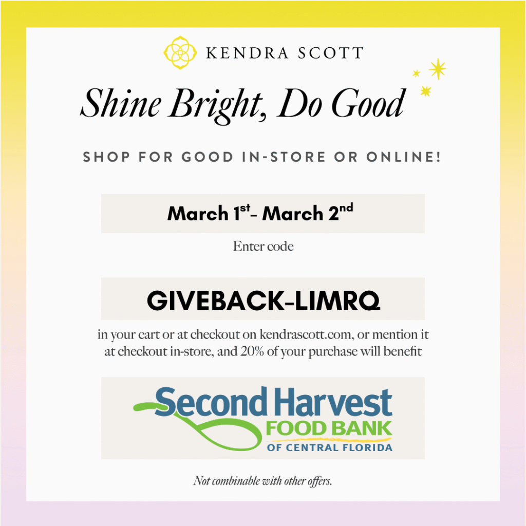 Join us online at Kendrascott.com March 1-2, 2026. Use code “GIVEBACK-LIMRQ” at checkout for 20% of your purchase to go towards fighting hunger!