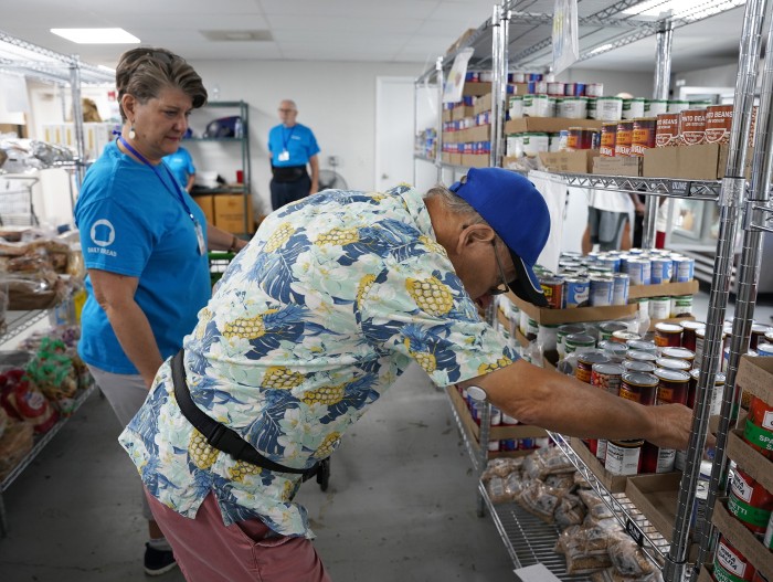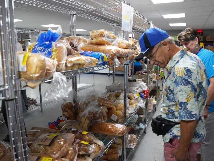 With help from Vicki, a regular volunteer, David fills his cart with canned beans, tomato sauce, pasta, and fresh bread.