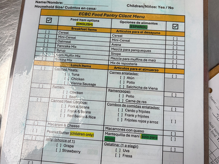 What sets the Dream Center apart from other local food pantries is its choice model. Neighbors schedule appointments online and, when they arrive, are welcomed inside to fill out a grocery list, selecting their preferred foods from a list of available options. A volunteer shops the shelves, refrigerator, and freezer based on their selections, gathering canned goods, fresh produce, and frozen meat.