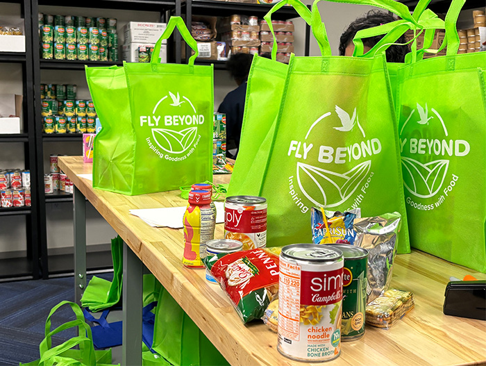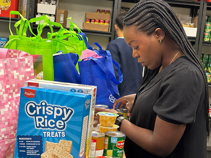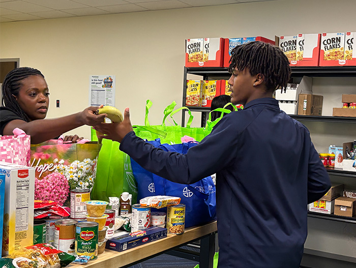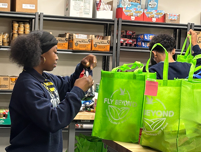 On a recent visit to NourishU, students printed orders and filled grocery totes with cereal, soup, juice, fruit cups, pasta, and bananas.