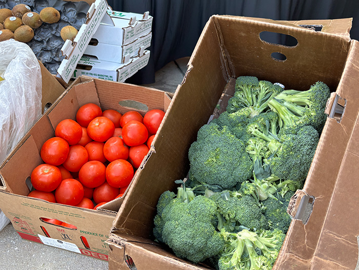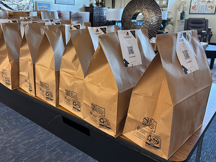 Once a week, Linda assembles a group of students, including Austin, to help pack grocery totes filled with nonperishable foods. Once a month, the same team also helps distribute fresh produce.